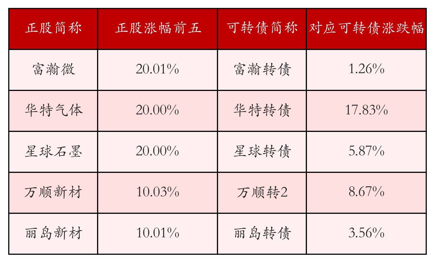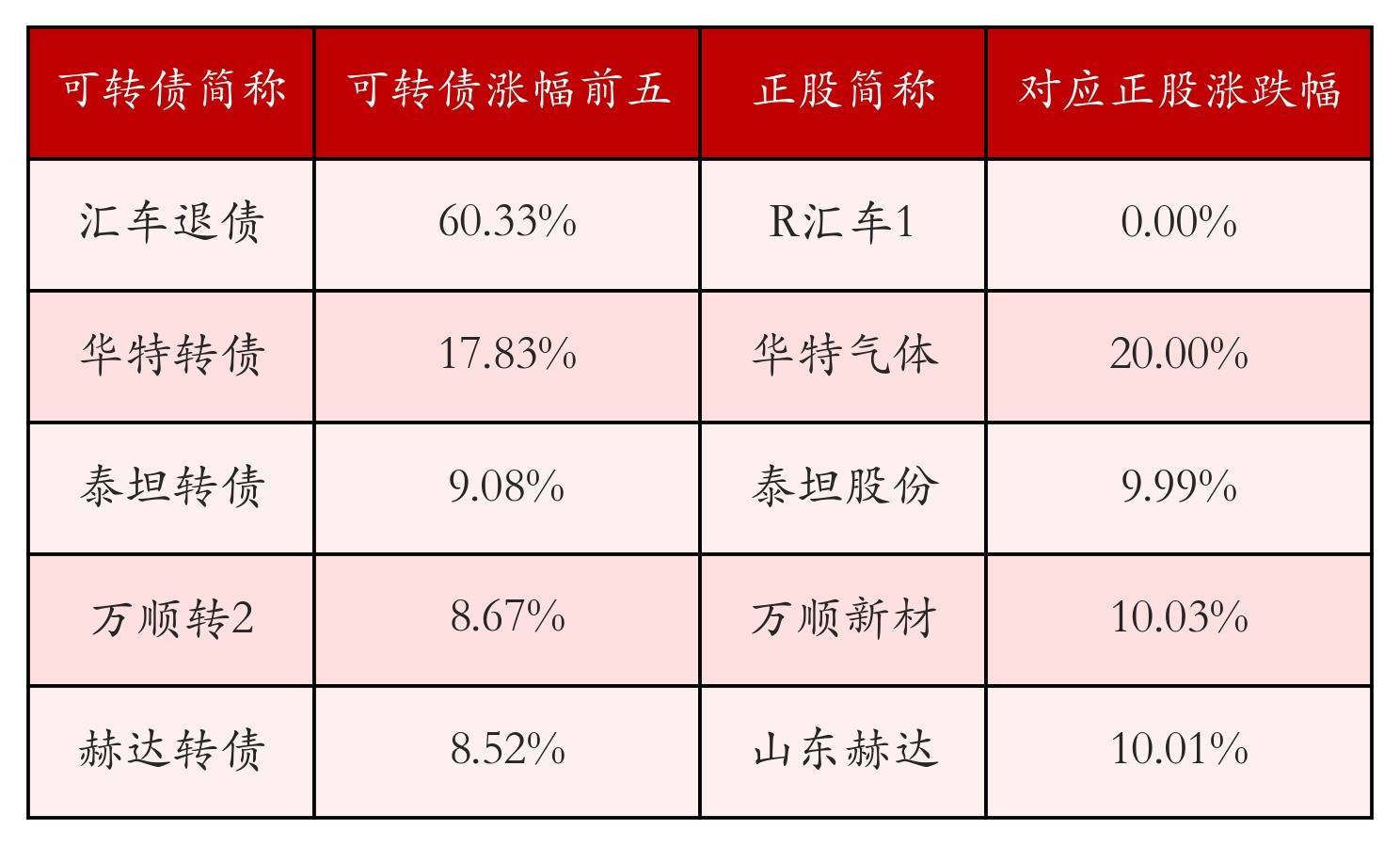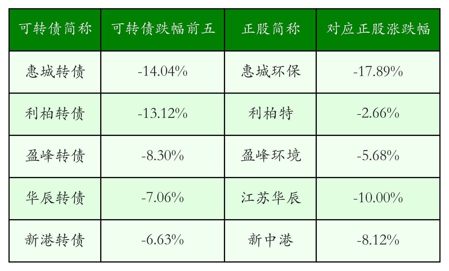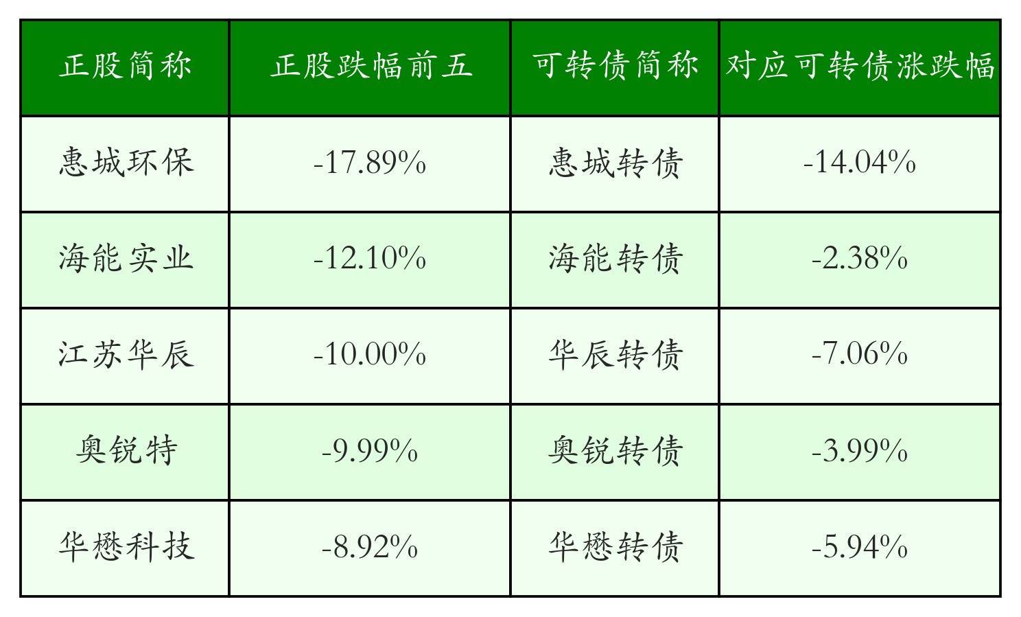 南财智讯4月24日电,盘后数据显示,债市方面,中证转债指数收跌0.35%,报514.03,成交额为797.25亿元。可转债方面河南炒股配资,今日共成交335只可转债河南炒股配资,其中108只收涨,1只收平,226只收跌。具体来看,18只可转债涨幅超过2%。其中汇车退债(404004)涨60.33%,华特转债(118033)涨17.83%,泰坦转债(127096)涨9.08%。今日有39只可转债跌幅超2%,惠城转债(123118)跌14.04%,利柏转债(111023)跌13.12%,盈峰转债(127024)跌8.3%。存在交易量的可转债所对应的正股中,120只收涨,9只收平,206只收跌。具体来看,19只可转债对应正股涨幅超过5%,其中,富瀚微(300613)涨停,收涨20.01%;华特气体(688268)涨停,收涨20.0%;星球石墨(688633)涨停,收涨20.0%。同时所对应的可转债:富瀚转债(123122)同涨1.26%;华特转债(118033)同涨17.83%;星球转债(118041)同涨5.87%。今日有16只可转债对应正股跌幅超过5%,江苏华辰(603097)跌停,收跌10.0%。同时所对应的可转债:华辰转债(113695)同跌7.06%;奥锐转债(111021)同跌3.99%。