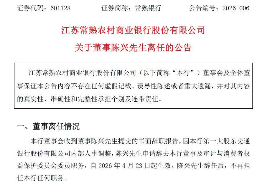 今日,常熟银行发布公告,宣布董事陈兴因第一大股东交通银行内部人事调整,于2026年4月23日起辞去董事及审计与消费者权益保护委员会委员职务。