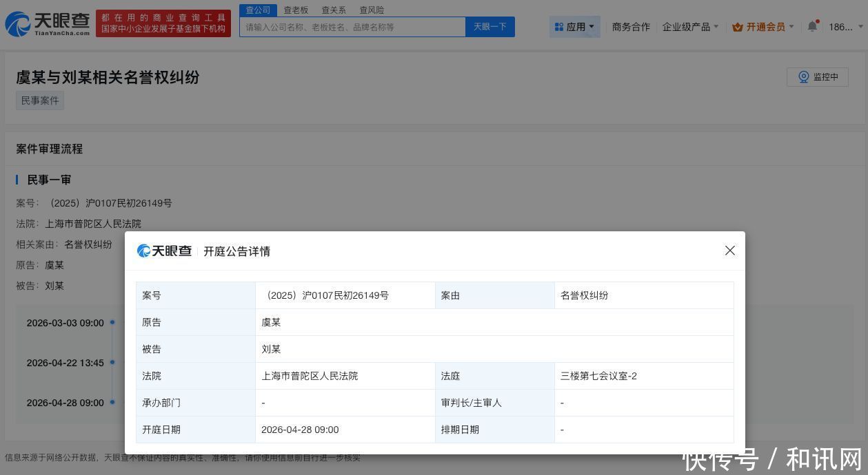 天眼查天眼风险信息显示股票配资讯,近日,虞书欣与刘某相关名誉权纠纷案件新增开庭公告,原告为虞书欣,该案将于4月28日在上海市普陀区人民法院开庭审理。